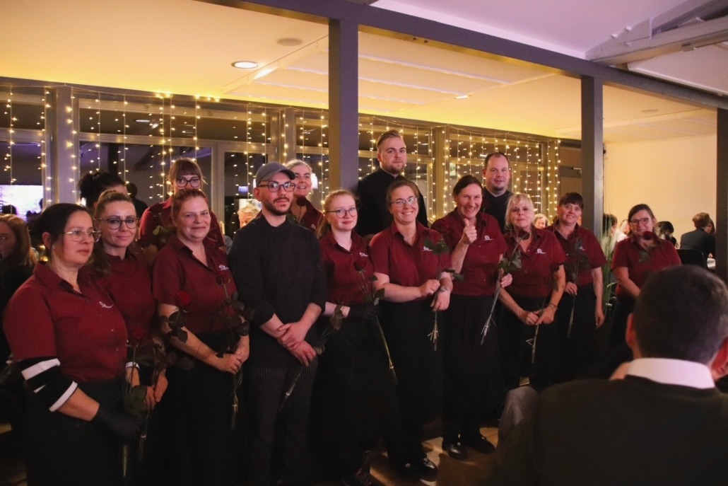 Nach optischen und akustischen Höhepunkten war Lukullus an der Reihe. Beim Festmenu gab es als Vorspeise eine Ziegenkäse-crème-brûlée, als Hauptspeise Rehgulasch oder Gemüseragout mit Schupfnudeln oder Kroketten sowie Rotkohl und Rosenkohl. Ein vorzügliches schokoladiges Dessert krönte die Abfolge. Die Küche der Steinmühle erhielt großartiges Feedback und tollen Applaus, als das Team sich für ein gemeinsames Foto aufstellte.