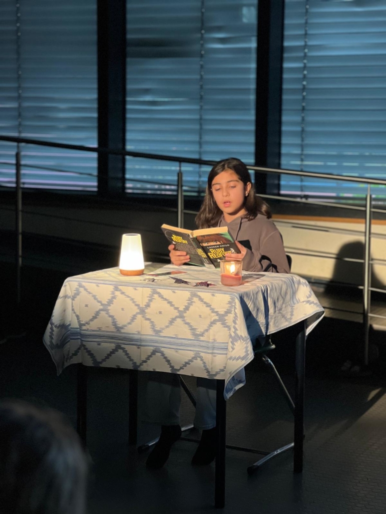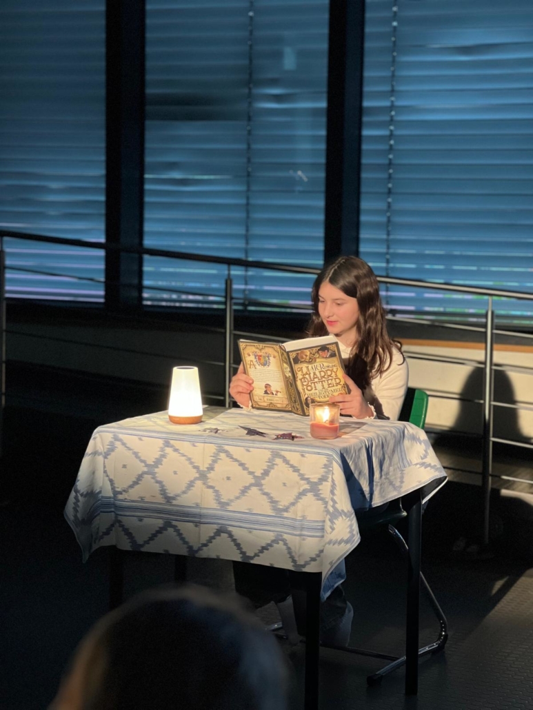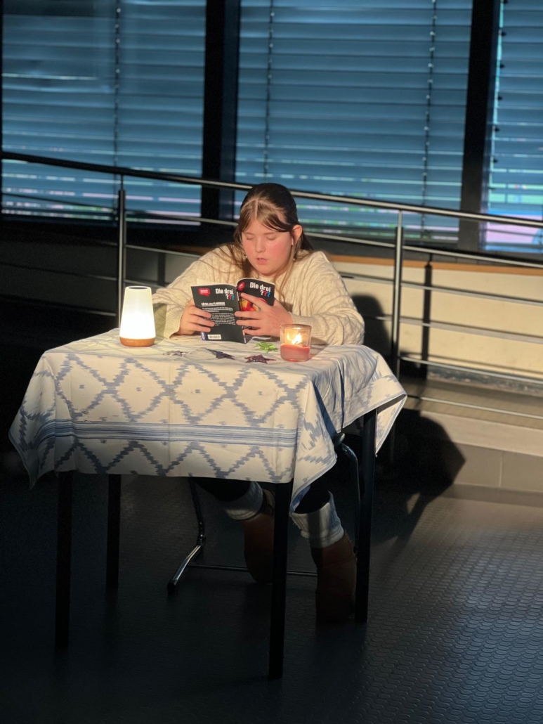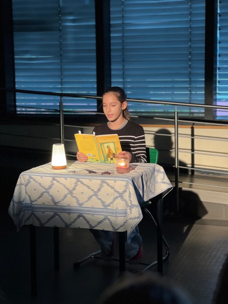Sie wussten alle vier, die Figuren, das Geschehen und die Atmosphäre ihrer gewählten Textstelle lebendig zu zeichnen und die zuhörenden Mitschülerinnen und Mitschüler auf den Stufen des offenen Lernbereichs im Centrum mit ihrem Vorlesen zu fesseln. Ob es um Frau Honig, Harry Potter und seinen Widersacher, die jüngste Agentin Ruby Redfort oder die drei ??? ging: Romilda, Carla, Nika und Tabea überzeugten mit ihrem Vortrag am Mittwoch, 11. Dezember, auch in dieser zweiten Runde, nachdem sie innerhalb der Klassen in den Wochen zuvor als ‚Siegerinnen‘ benannt worden waren.
