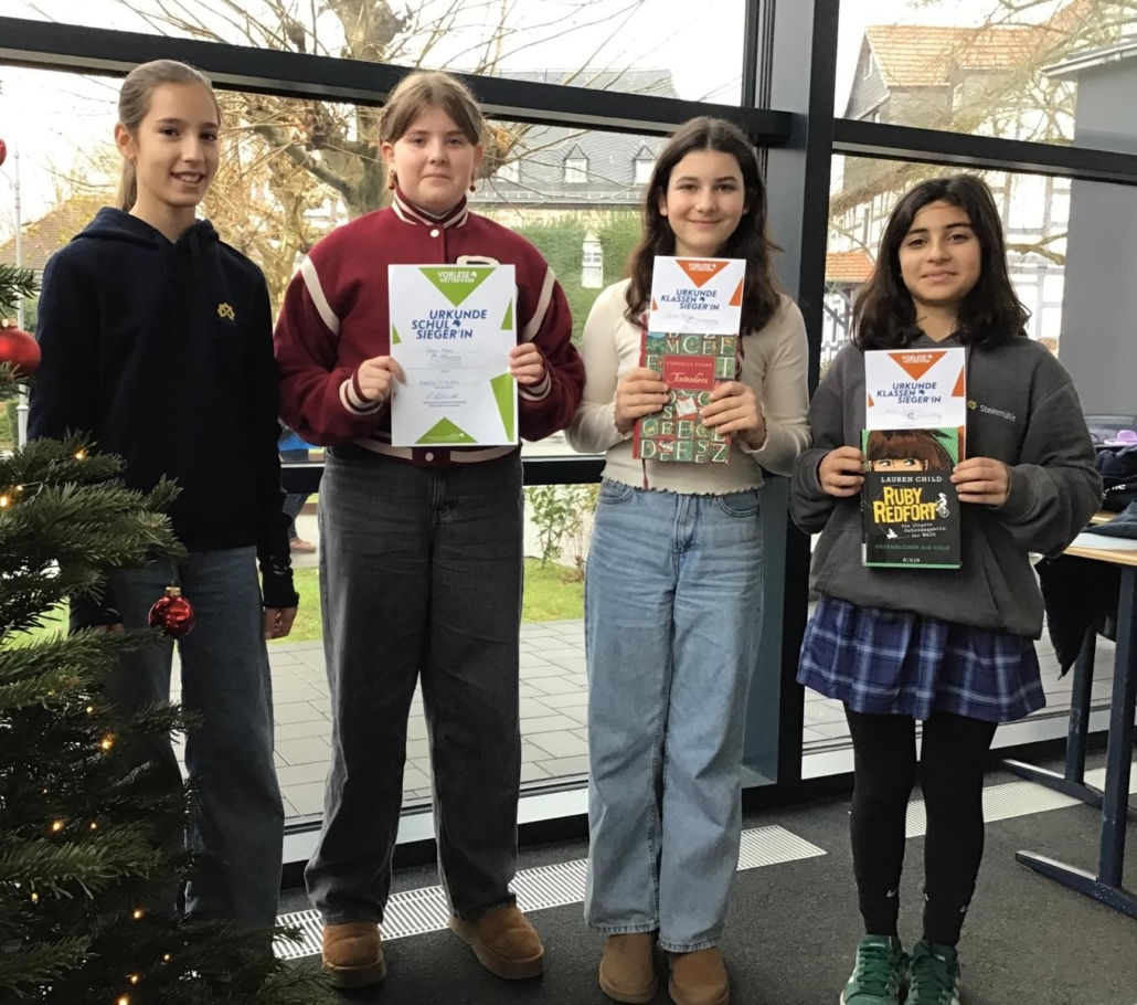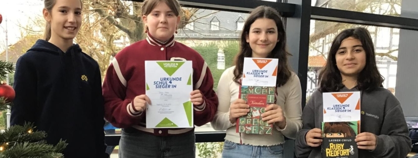 Eine tolle Nachricht aus dem Jahrgang 6 haben wir mit in das neue Jahr genommen, nämlich die erfolgreiche Teilnahme der Schülerinnen Romilda, Carla, Nika und Tabea am Vorlesewettbewerb 2024 der Klassen 6 an der Steinmühle. Der Wettbewerb, der am Ende eines jeden Jahres stattfindet, gab auch diesmal wieder ein Beispiel für die Lesekompetenz unserer Unterstufe.