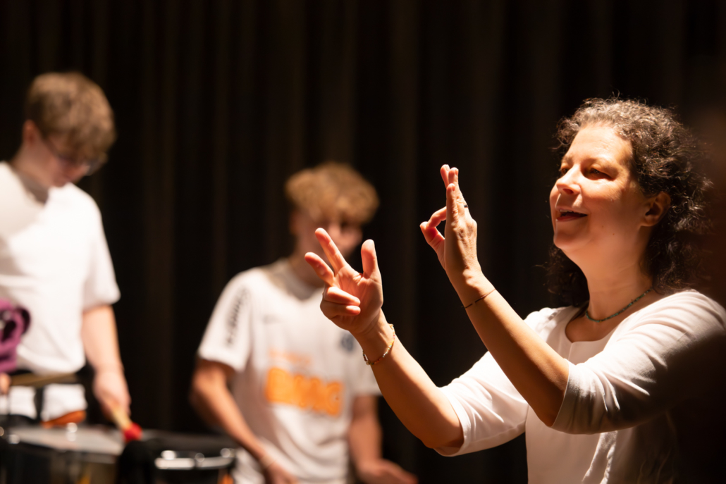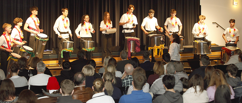 Angekündigt von Ulrike Wilmsmeyer, bildete das 12köpfige Ensemble aus dem Jahrgang 11 den Anfang. Mit seinem Sambatrommelwirbel holte es mit starker Akustik das Publikum ins Hier und Jetzt, unter bewährter Leitung von Kerstin Itzenhäuser, belohnt durch langanhaltenden Applaus.