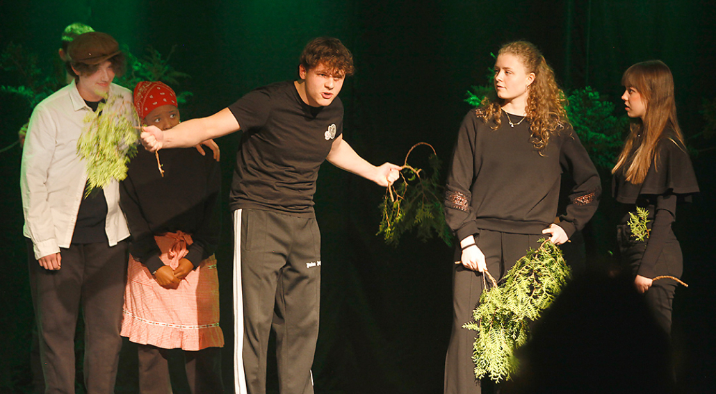 Hänsel und Gretel nahmen anschließend die Bühne ein, Darstellendes Spiel aus dem Jahrgang 11. Angekündigt von Nina Merzenich als „Letzte Probe“ folgten kurze Abläufe einer modernen Inszenierung, bei der die Protagonisten wie beim Karneval „Kamellen“ ins Publikum warfen. Dem Publikum wurde der 24. Juni als „Save the Date“ nahegelegt. Dann nämlich sei das Stück zur Vollendung gebracht.