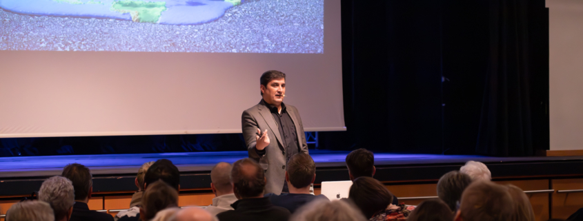 Cem Karakaya setzt auf Aufklärung, damit Mechanismen verstanden werden, damit kein Schaden am Computer entsteht und kein Schaden für deren Besitzer. „Wussten Sie, dass zwei Porträtfotos im Netz ausreichen, um von Ihnen ein Video zu machen, auf dem Sie alle Sprachen dieser Welt sprechen, mit exakter Lippenbewegung?“ Der Referent macht es vor und zeigt es in seiner Präsentation: Cem Karakaya spricht plötzlich französisch. KI macht’s möglich.