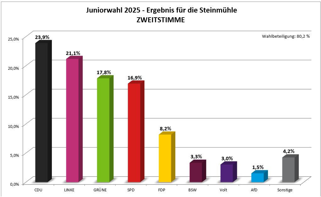 Die CDU wurde an der Steinmühle, wie auch schon bei der letzten Juniorwahl im Rahmen der Europawahlen, mit 23,9 Prozent stärkste Kraft.