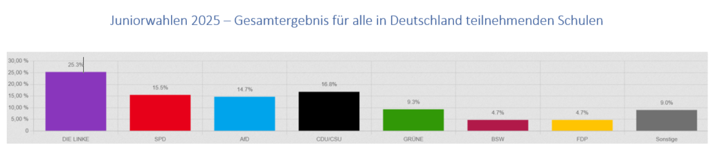 Die Ergebnisse der Juniorwahlen könnten an der ein oder anderen Stellen für Überraschung sorgen, insbesondere, wenn man sie mit dem Ergebnis der tatsächlichen Bundestagswahlen oder auch mit dem Gesamtergebnis der Juniorwahlen aller in Deutschland teilnehmenden Schulen vergleicht.