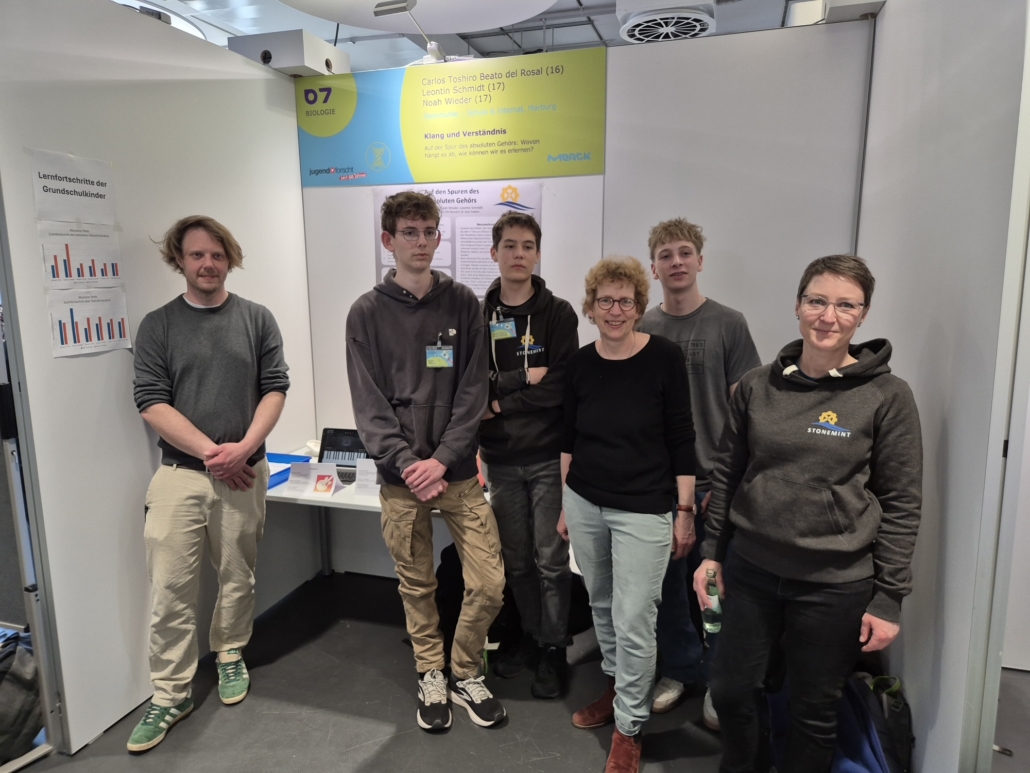 In Darmstadt stellten sich erneut Toshiro Beato, Leontin Schmidt und Noah Wieder vor und präsentierten ihr Projekt „Auf der Spur des absoluten Gehörs: Wovon hängt es ab, wie können wir es erlernen?“ Sie errangen Platz 3 in Biologie, wobei ihnen zusätzlich der Sonderpreis des Bundesverbandes der Hörsysteme-Industrie zuerkannt wurde.