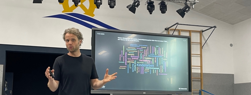 Die Übernahme sozialer Verantwortung und nachhaltiges Wirtschaften sind für Unternehmen mit Kosten verbunden. – Kann sich das überhaupt noch ökonomisch lohnen? fragte der Referent in die Runde, bestehend aus Schülerinnen und Schülern des Steinmühlenjahrgangs 11. Sie hatten die richtige Antwort parat. Damit dies so ist, setzen Firmen auf Marketing, auf die Bildung einer entsprechenden Reputation, die bis zum Verbraucher heranwirkt.