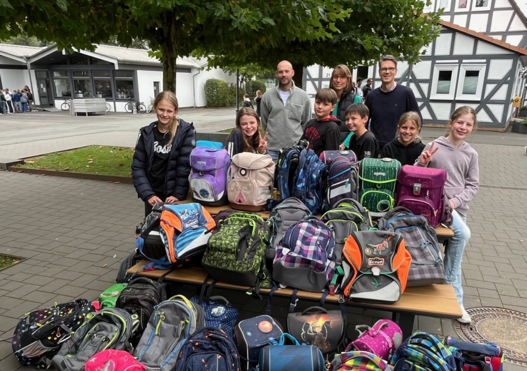 Ihre gespendeten Ranzen für Kinder in der Marburger Partnerstadt Sibiu präsentierten Schülerinnen und Schüler der Unterstufe ganz stolz dem Vertreter der Marburger Jugendförderung (hinten links) sowie Theresa Großer und Björn Gemmer vom Schulleitungsteam der Steinmühle. Die abgelegten Schultaschen, die teilweise kaum Gebrauchsspuren aufweisen, kommen in Rumänien solchen Familien zugute, die sich keine neuen Ranzen leisten können.