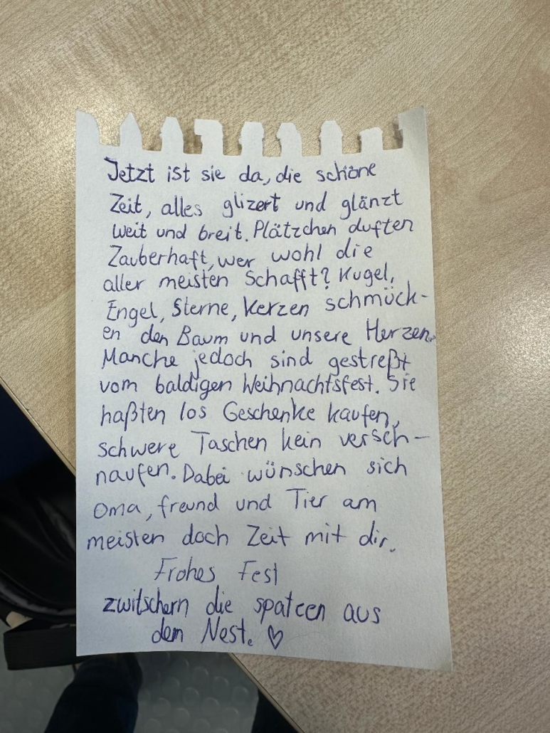Manche Wichtelgeschenke können zu Herzen gehen – in der Klasse 5 c von Dr. Claudia Röder war das zum Beispiel so. Nicht nur entgegennehmen und gut – nein! Lucia Albert schrieb als Dank für das Wichtelgeschenk von Weihnachtsmann Jakob Claar gleich ein ganzes Gedicht.