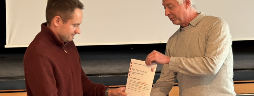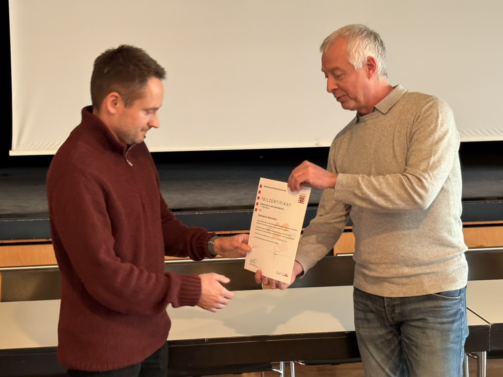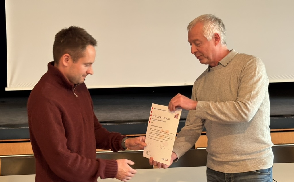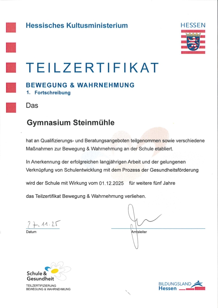 Für die gelungene Zusammenführung von Schulentwicklung mit dem Prozess der Gesundheitsförderung erhielt das Gymnasium Steinmühle vom Hessischen Kultusministerium die Zertifizierung „Bewegung & Wahrnehmung“. Karsten Vestweber, einer der Schulsportkoordinatoren am Staatlichen Schulamt, überreichte die Urkunde im Beisein von Schulleiter Björn Gemmer an Schulsportleiter Marcel Kalb.
