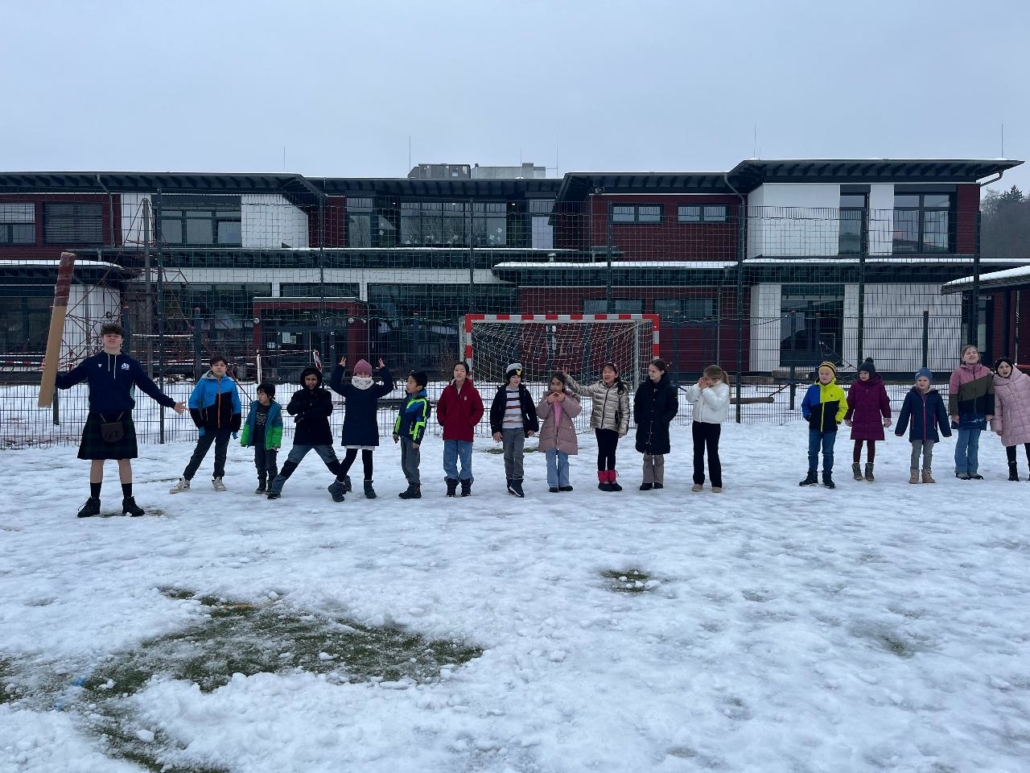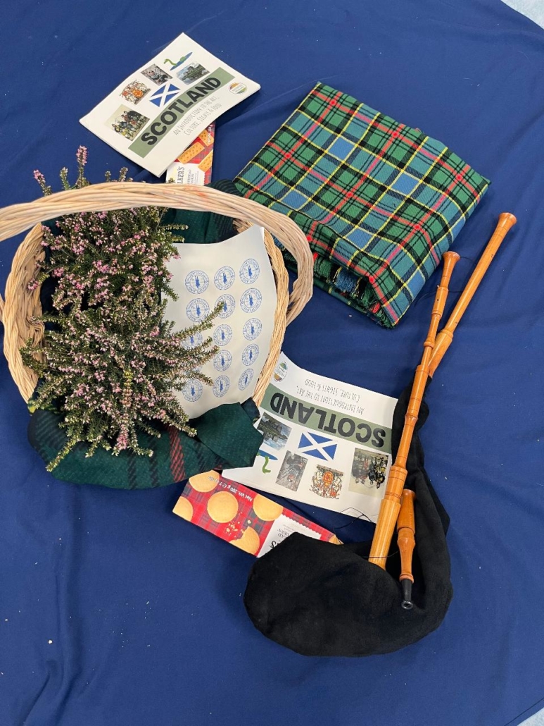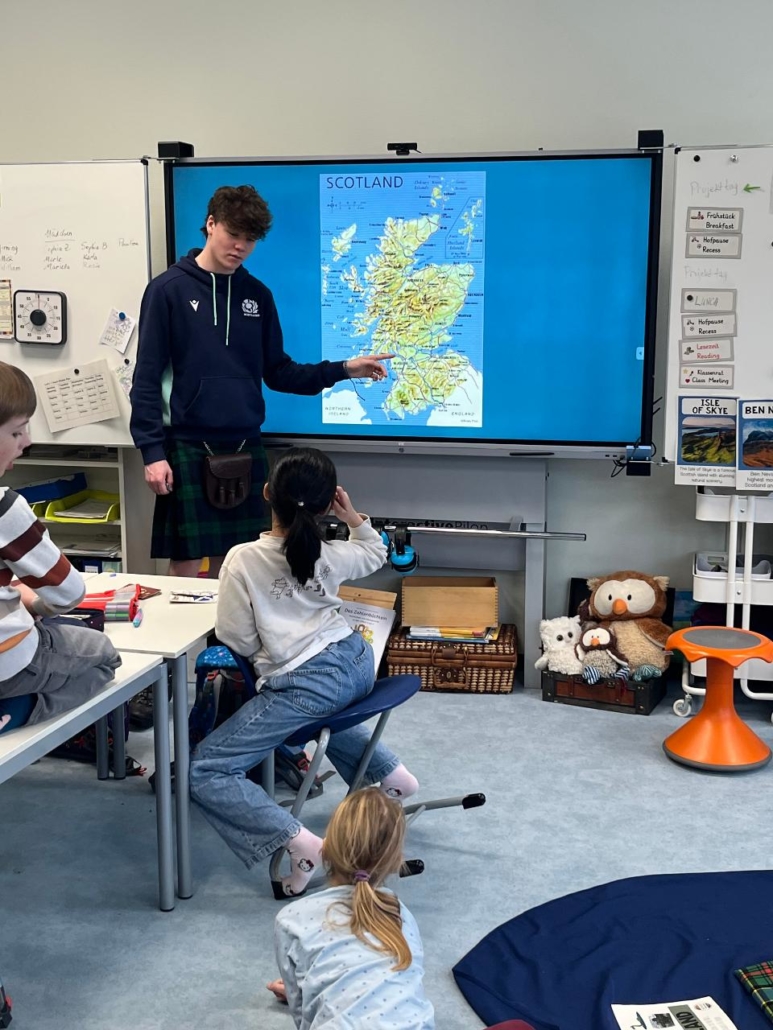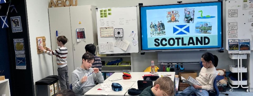 Mrs. Lori, stellvertretende Leiterin der Bilingualen Grundschule, präsentierte zusammen mit dem „echten“ Schotten Cameron alles über Schottland. Die Kinder konnten sich ein Bild davon machen, wie der Schottenrock im Alltag aussieht: Cameron trug ihn nämlich – und ließ sich zum Abschied mit der gesamten Gruppe auf dem Schulhof ablichten. Nicht fehlen durfte natürlich eine musikalische Einlage mit dem Dudelsack.