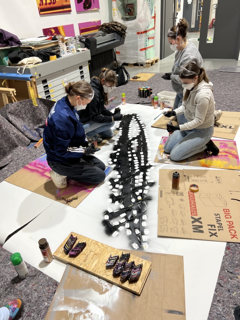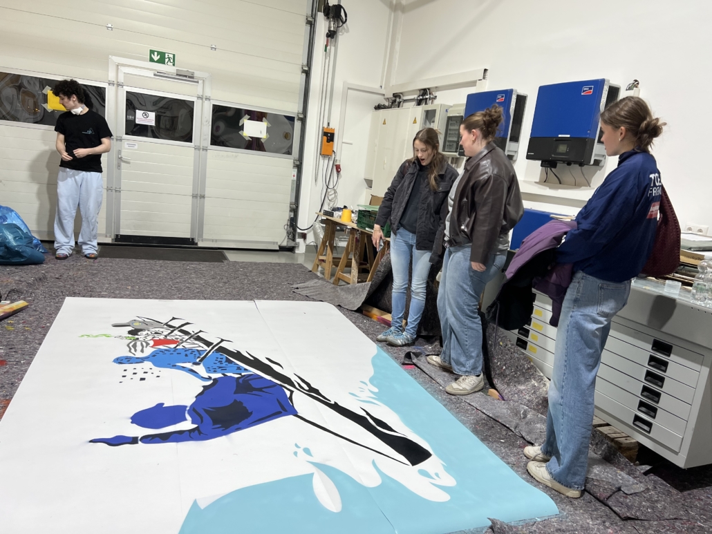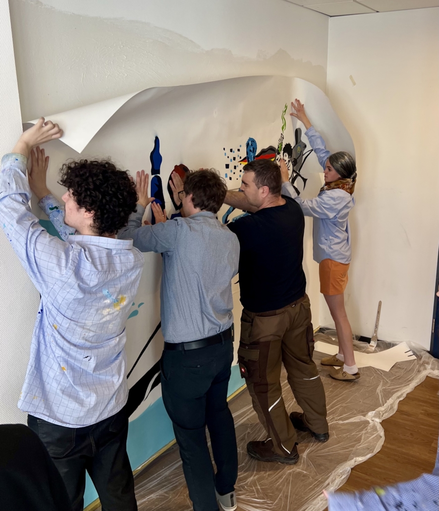 Das „Wandbild Vergangenheit, Gegenwart und Zukunft der Steinmühle in einem Boot“, wie es offiziell heißt, musste nach den doch erheblichen Mühen und Einsätzen für seine Details am Ende sicher und behutsam auf die Wand aufgebracht werden. Dabei half ein Teil des Steinmühlen Haustechnik-Teams. Es instruierte die Schülerinnen und Schüler in Tapeziertechnik, hinsichtlich Auswahl des richtigen Klebstoffes („Kleber statt Kleister“), wobei die jungen Menschen gleich lernten, dass Kleber die größere Haftstärke hat.
