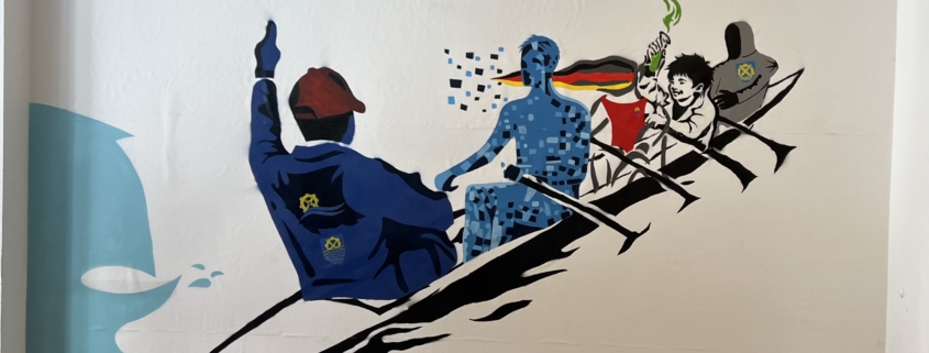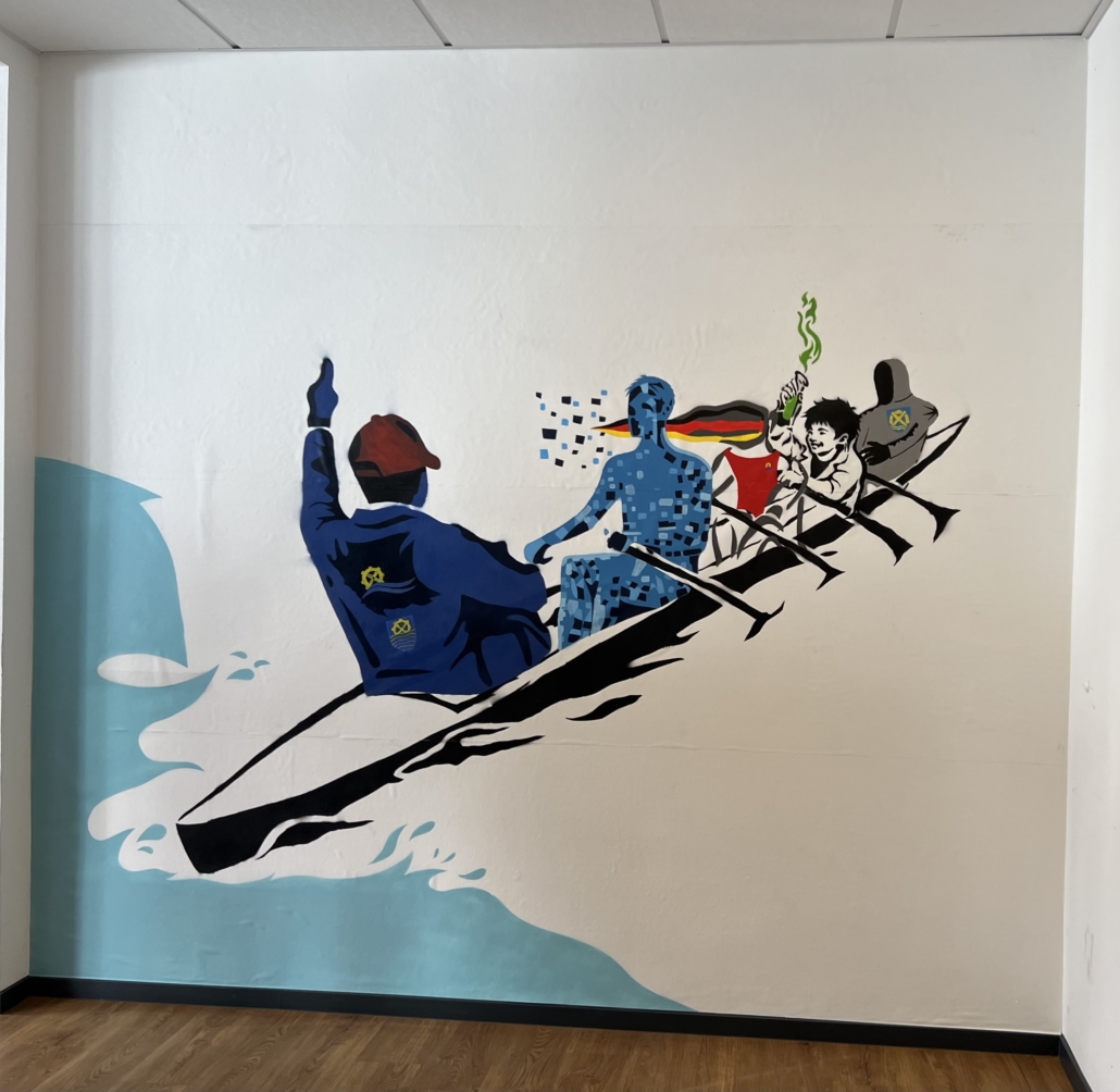Ein ganz besonderes Bild ziert seit Dienstag die Wand am Durchgang vom Hauptgebäude zur Cafeteria. Der fünfköpfige Leistungskurs Kunst aus dem Jahrgang 13 verewigte sich dort mit einem Gemälde, das den Titel „Zeitreise im Ruderboot“ tragen könnte. Unter Leitung von Kunstlehrerin Ines Vielhaben entstand mittels Graffiti-Sprühfarbe und feinen Acryl-Pinselstrichen die Darstellung von vier Personen im Ruderboot. Jede für sich verkörpert einzelne Zeitabschnitte an der Steinmühle und rudert gemeinsam mit den anderen durch die Schulgeschichte.
