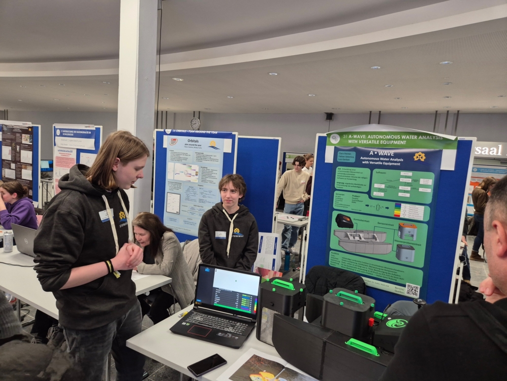 Einen dritten Preis, verbunden mit dem Sonderpreis „Make Jahresabonnement“, errangen Fabian Sotonica, Luis Gerloni und Clara Steiner für Optimierungsmaßnahmen zum professionellen Einsatz ihres entwickelten Low cost-Bootes zur halbautomatischen Bestimmung der Gewässergüteklasse. Im Fokus lagen dabei einzelne Funktionen und die autonome Wegepunkt-Verfolgung, um eine komplett selbständige Probenentnahme und nachfolgende Analysen durchzuführen.
