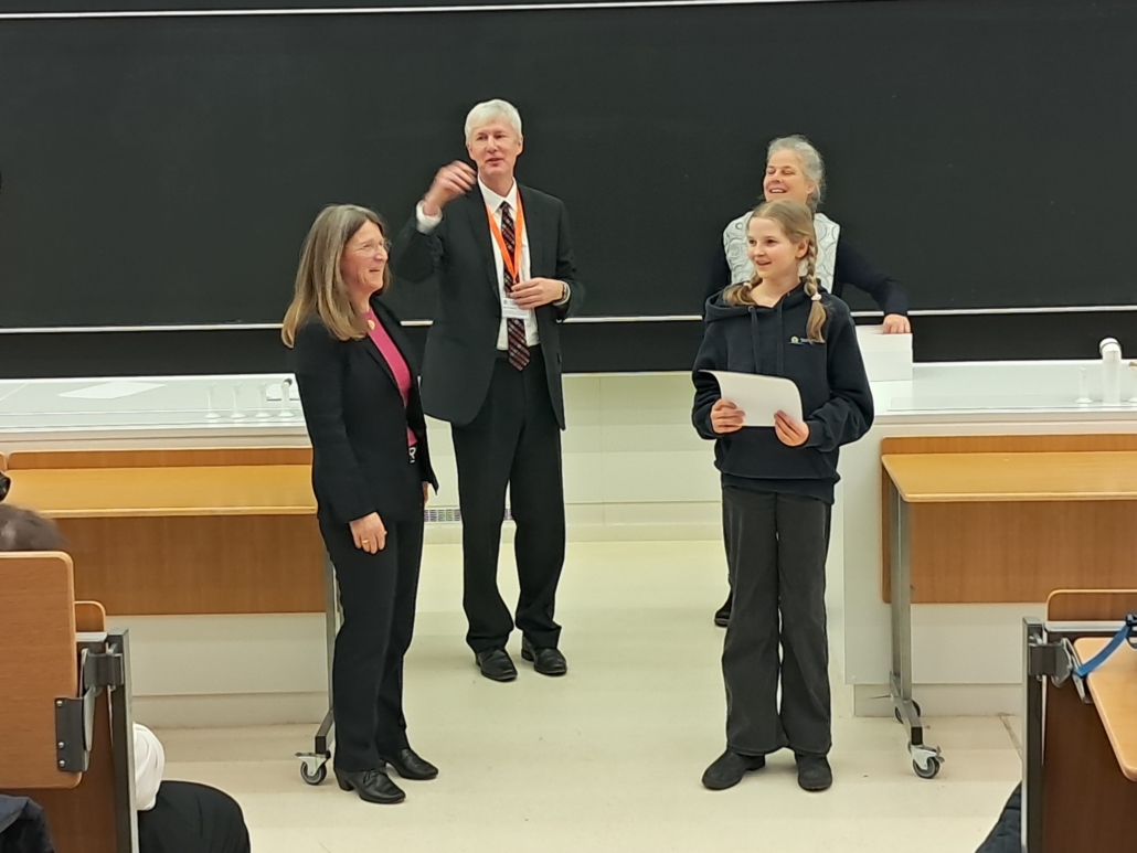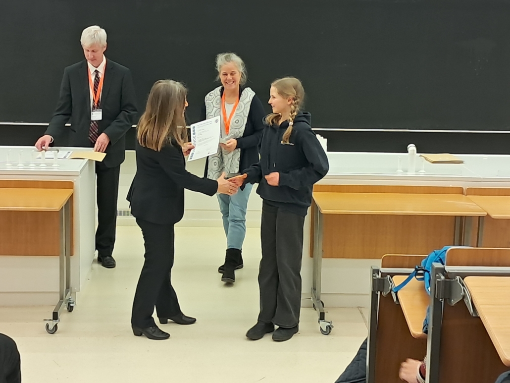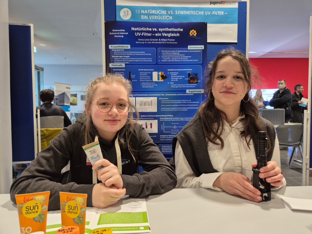 Einen ersten Platz im Fach Chemie errangen Anna-Lena Griesler und Maya Fischer aus Klasse 9. Anknüpfend an ein Projekt des Vorjahres untersuchten sie die Möglichkeit, synthetische und potenziell bedenkliche UV-Filter in konventionellen Sonnencremes durch natürliche und langzeitstabile Extrakte zu ersetzen, was einer besonderen Sensorapparatur durch ein UV-VIS-Spektrometer bedurfte.