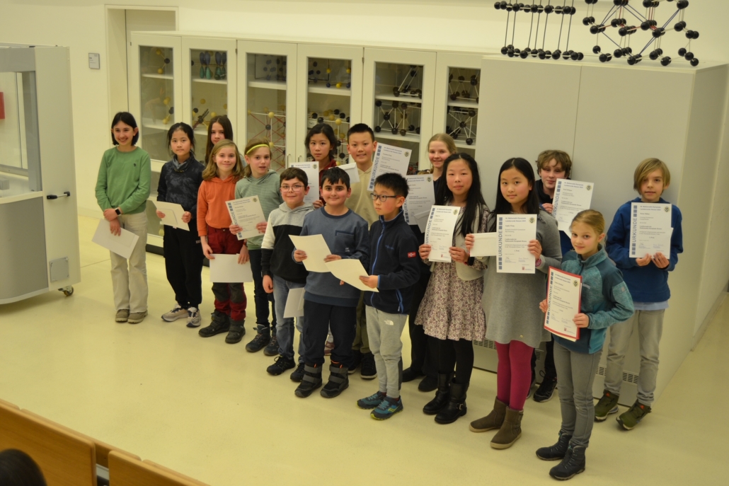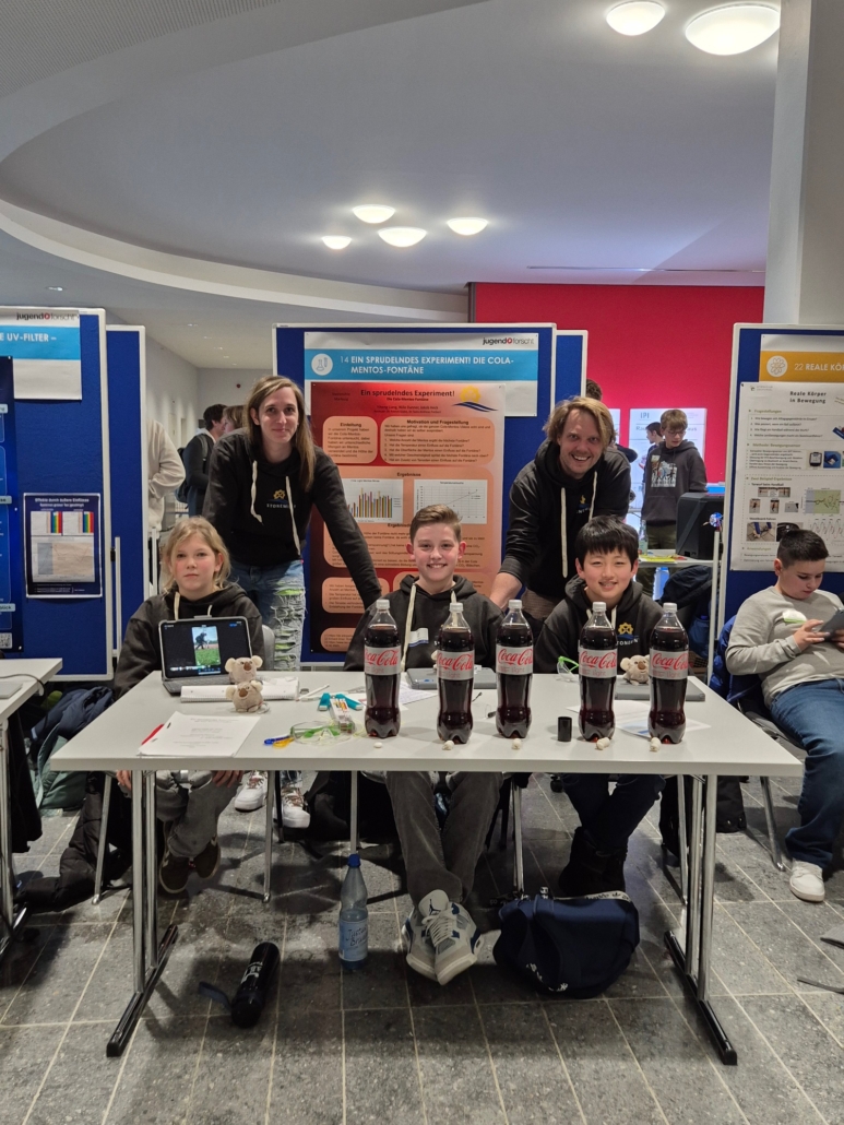 Platz 3 ging auch an Yiheng Liang, Niilo Danner und Jakob Heck aus der Klasse 6. Das Trio hatte die Höhe der „Cola-Mentos-Fontäne“ in Abhängigkeit von Menge, Zustand und Temperatur der Zutaten untersucht. Die drei Jungforscher interessierte auch, welche Geschwindigkeit die Fontäne besitzt und ob ein weiterer Zusatz von Spülmittel etwas an der Höhe verändert.