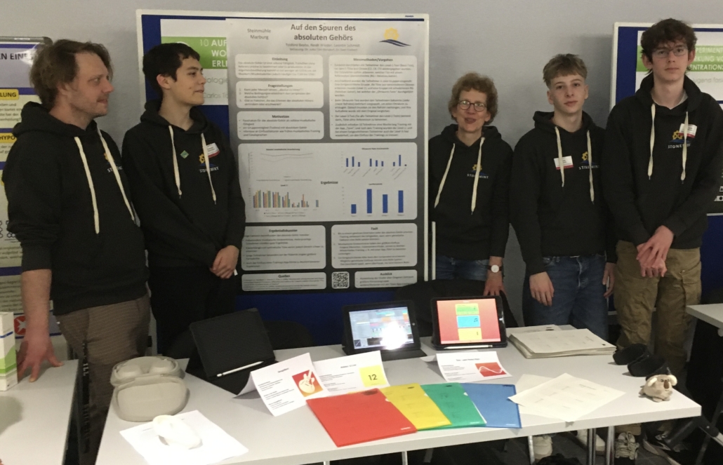 Über Platz 1 in Biologie freuten sich Toshiro Beato, Leontin Schmidt und Noah Wieder. Das Forschertrio befasste sich mit dem Thema des absoluten Gehörs, wovon dieses abhängt, wodurch es erlernt werden kann – und ob überhaupt. Zum Thema hatten die drei Jungforscher Fragebögen entworfen und Tests für eine Studie durchgeführt.