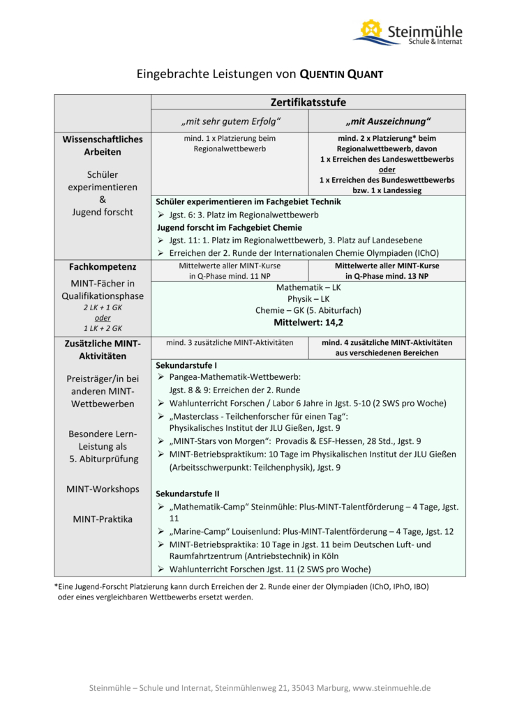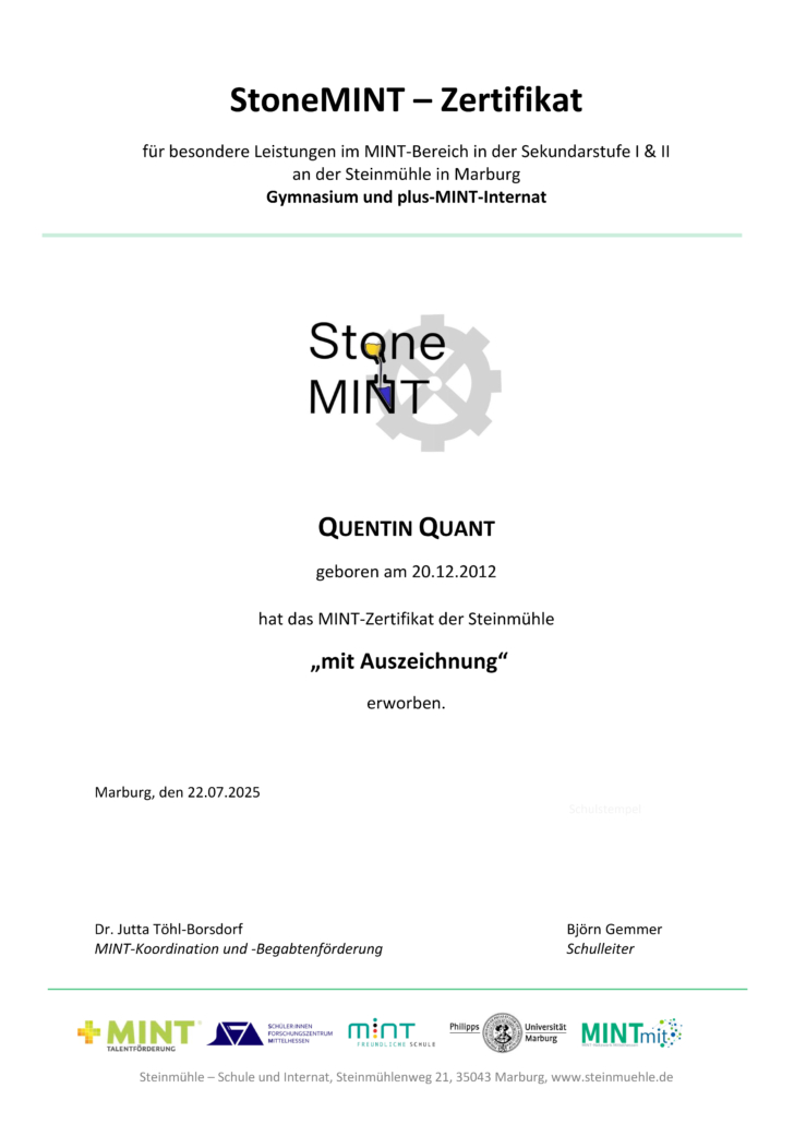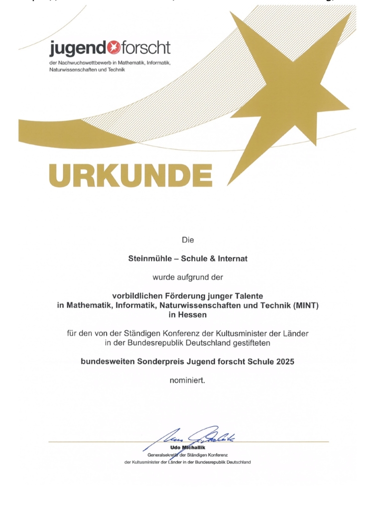Beim Regionalenscheid Hessen-Mitte von Jugend forscht, Deutschlands bekanntestem Nachwuchswettbewerb für Mathematik, Informatik, Naturwissenschaften und Technik, hat die Steinmühle gleich vier Mal Platz 1 errungen. Nachdem ein Team des plus-MINT-Internats Steinmühle im vergangenen Jahr bis in den Bundeswettbewerb gelangte, ist das erneut ein hervorragender Start in dieses Format. Zum 60. Mal lädt es junge Forscherinnen und Forscher ein, ihre Projekte vor einer 24köpfigen Jury zu präsentieren.