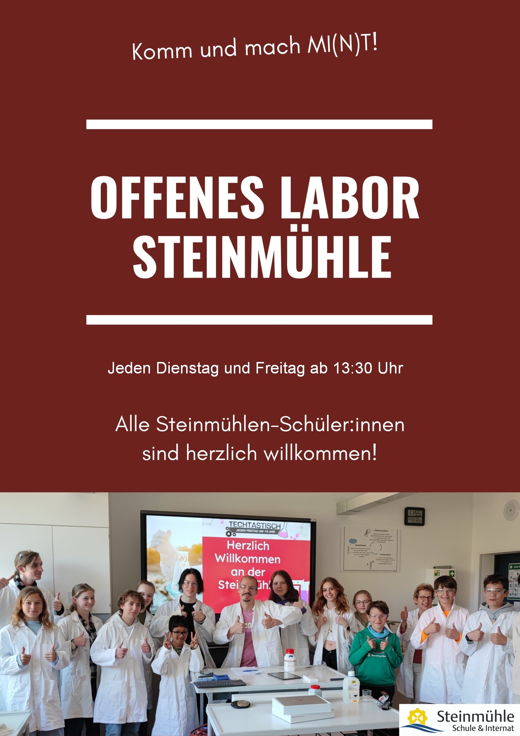 Lust auf Forschen? Interessiert an Jugend Forscht oder anderen naturwissenschaftlichen Wettbewerben und Experimenten? Dann kommt ins Schüler:innenlabor Steinmühle (R127), jeden Dienstag und Freitag von 14 bis ca. 16 Uhr.